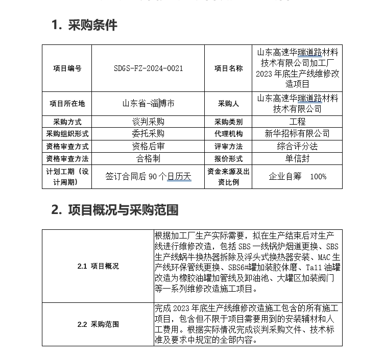 山東高速華瑞道路材料技術(shù)有限公司加工廠2023年底生產(chǎn)線維修改造項目談判采購公告